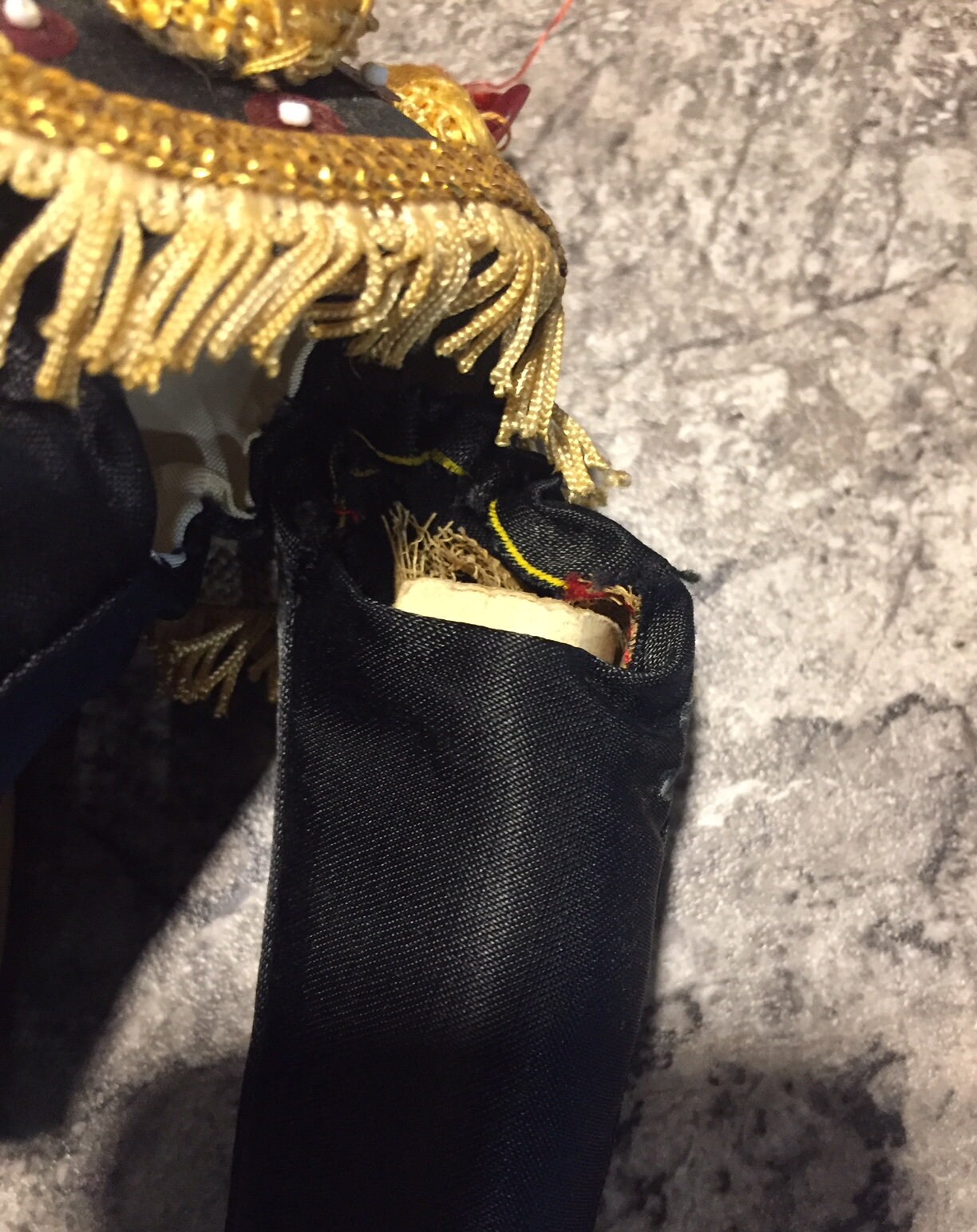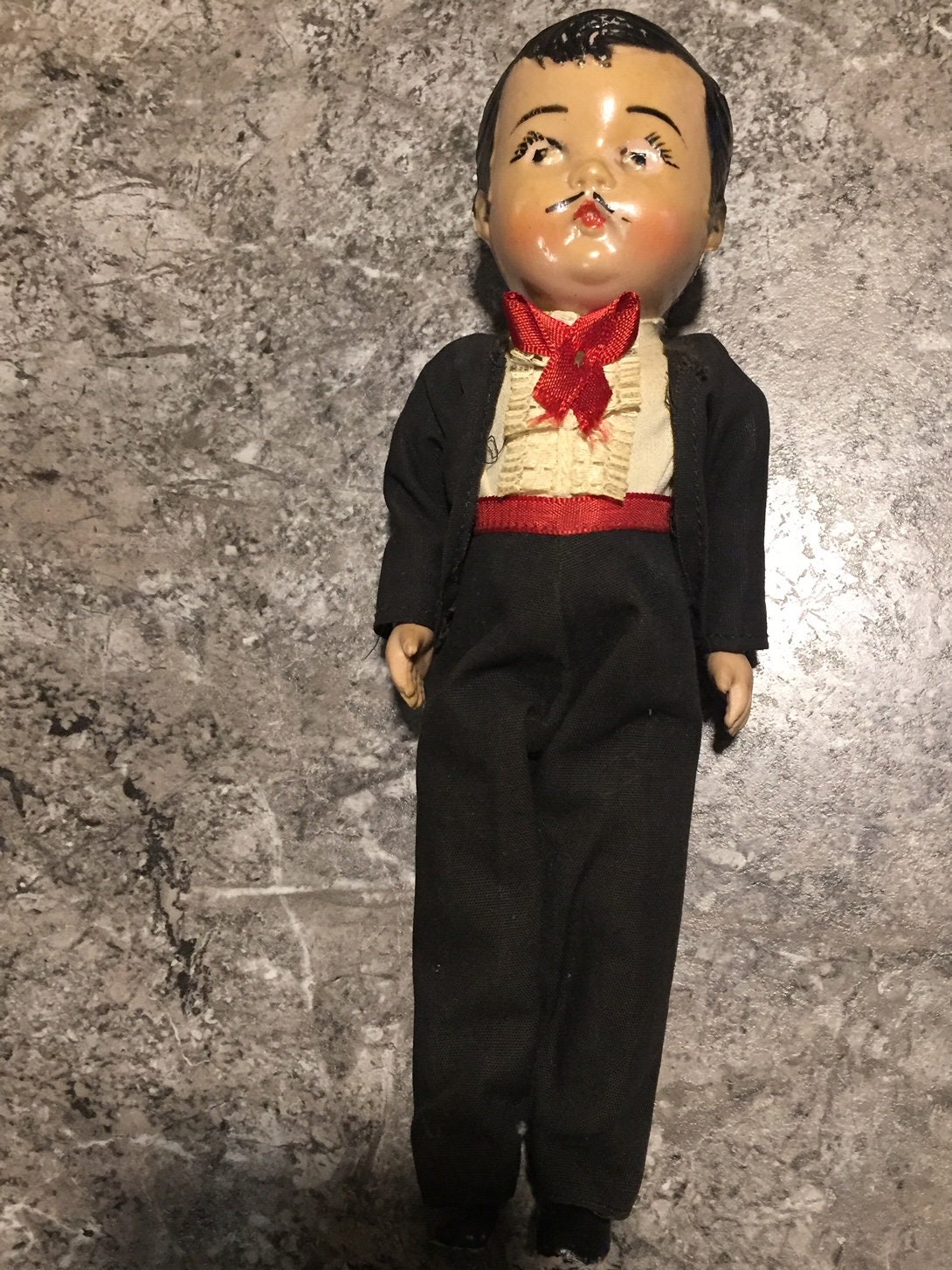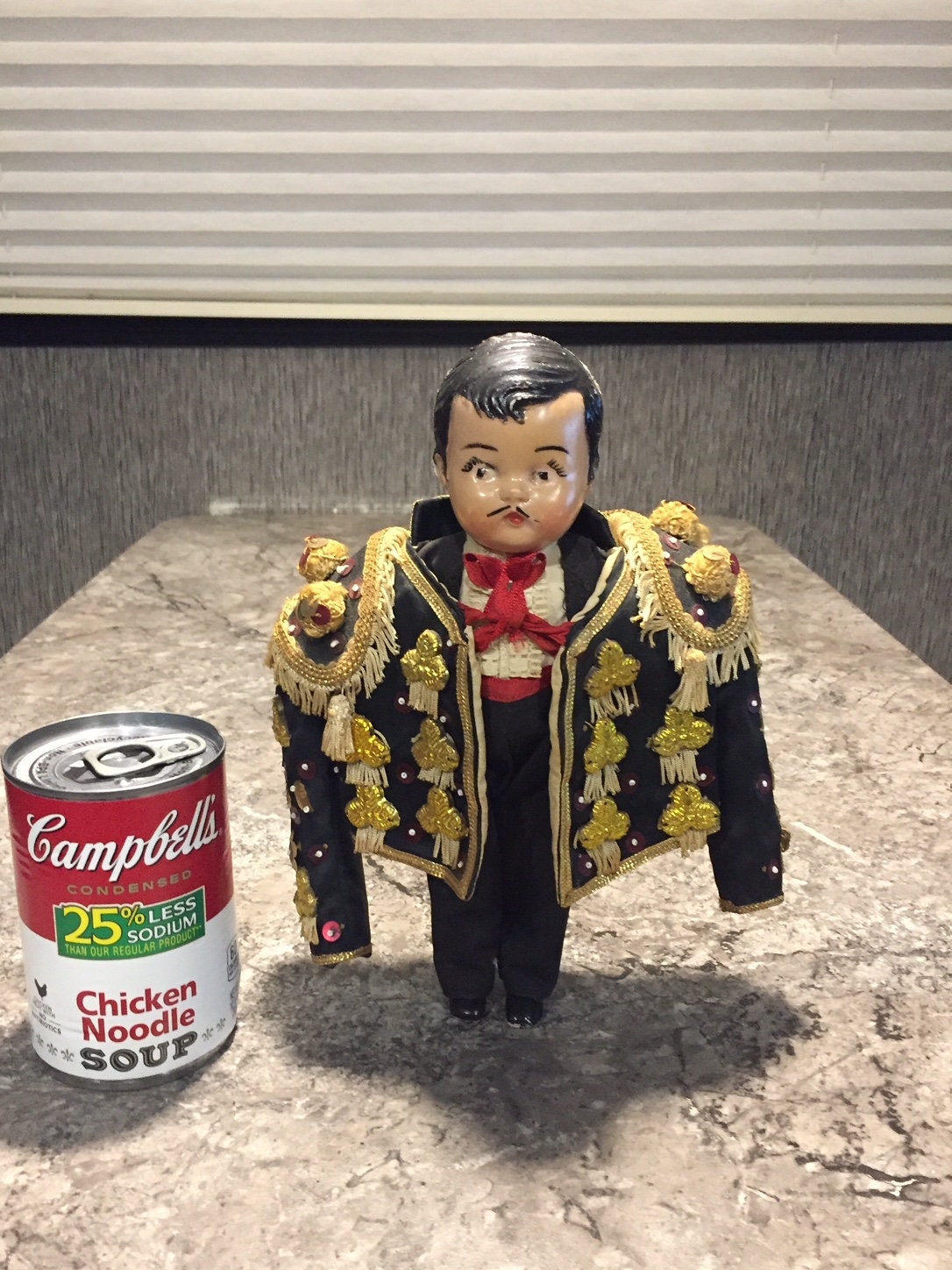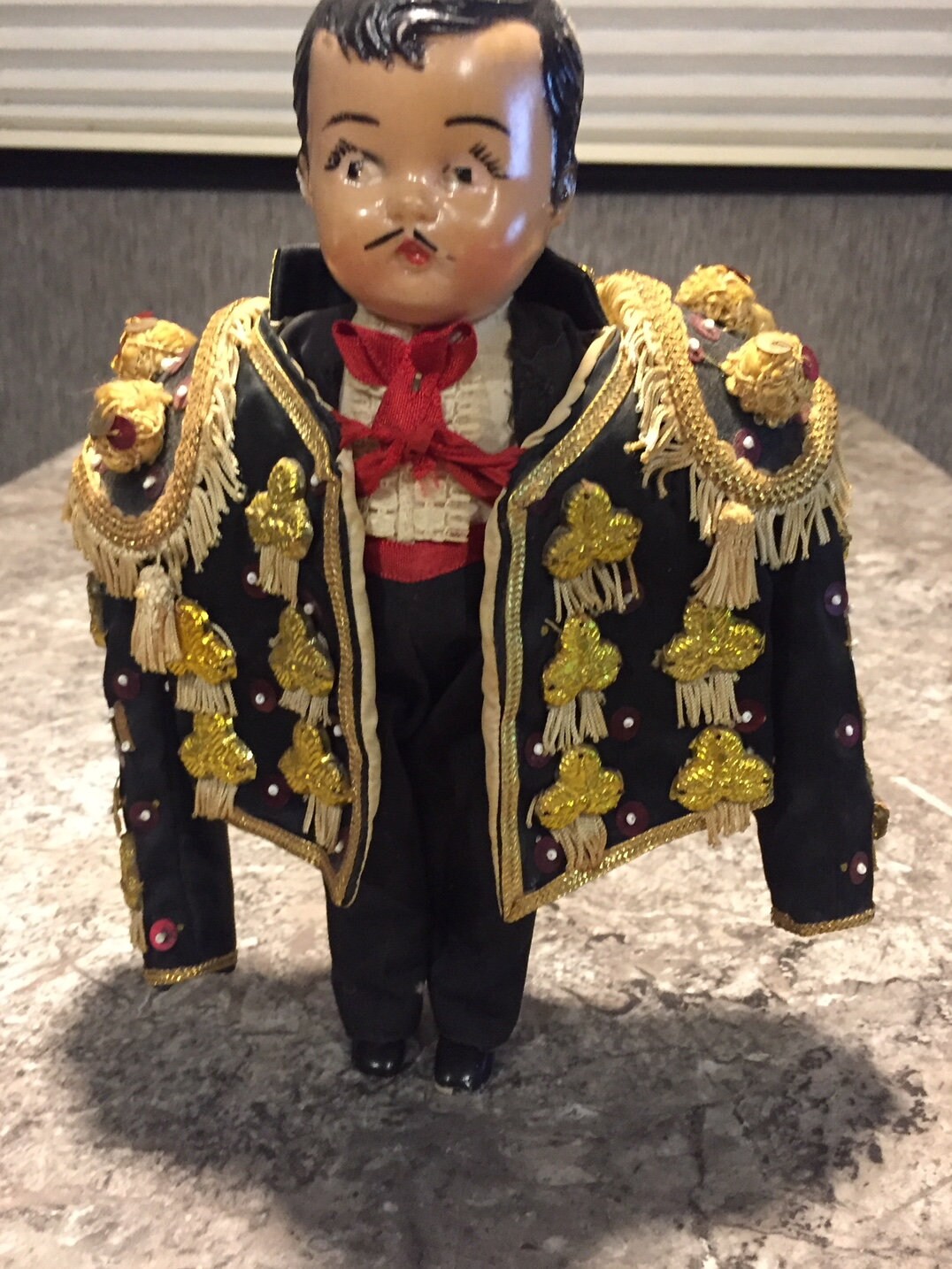 Offered for sale is a wonderful vintage Xafmas Matador Jacket with doll. Very ornate jacket with gold medallions and tastles. Doll is plastic and wearing a suit, ruffled shirt, and red tie. Doll measures: 8.5" tall. Has moveable arms. Condition: doll in very good vintage condition- has some black paint loss mostly on back of head (painted on hair) Jacket has an arm sleeve separation at the shoulder which can easily be sewn (see last photo) This is quite old and does have a kind of a musty smell due to age and storage.