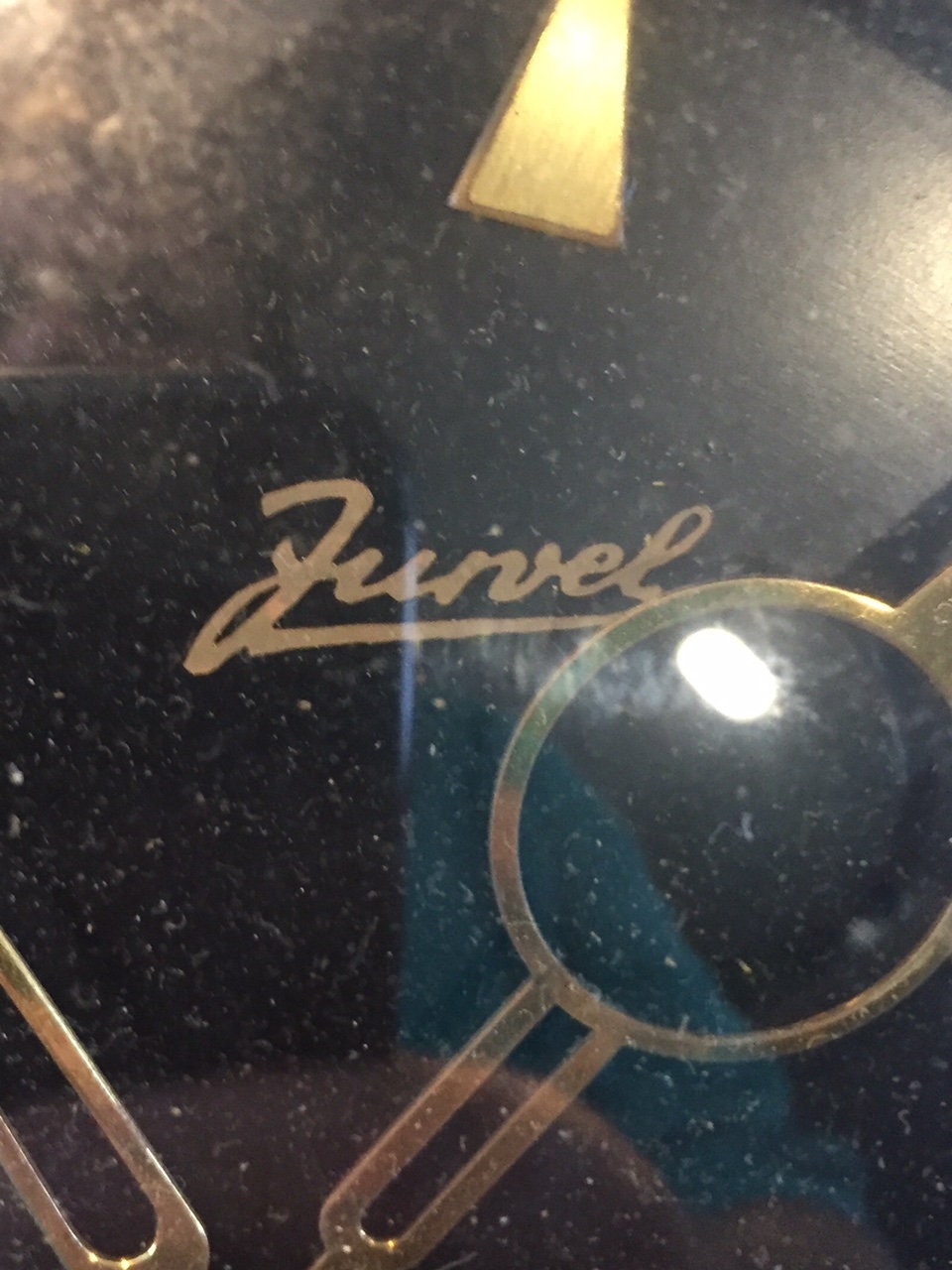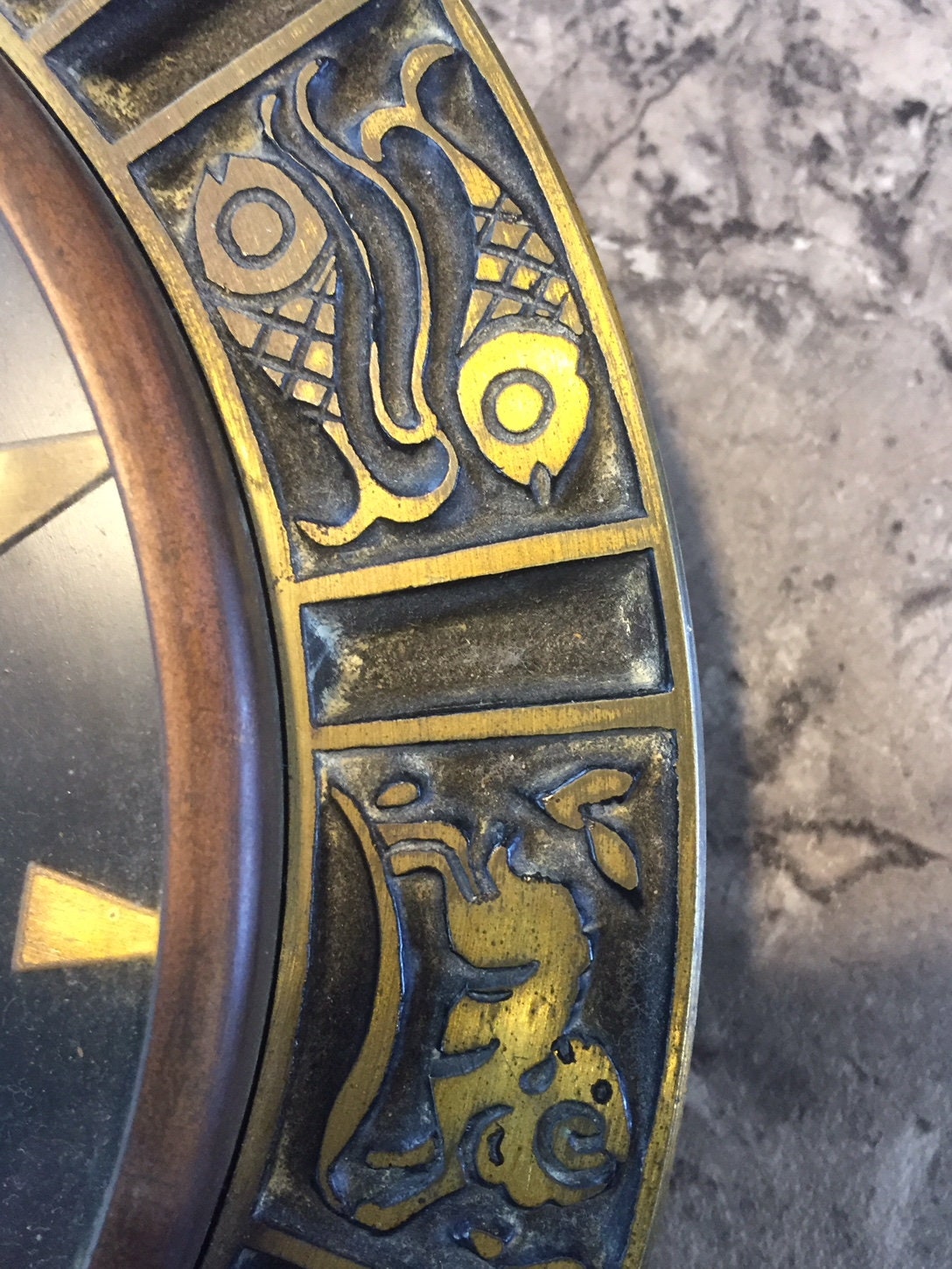 Offered for sale is a beautiful and rare Jurvel Zodiac wall clock. Brass Zodiac symbols in relief surround this clock - the hands and dial behind convex glass front. Size: approx. 8.75" diameter. Very good working condition-keeps good time - this is a wind up clock mechanism. This is a nice heavy and substantial clock.