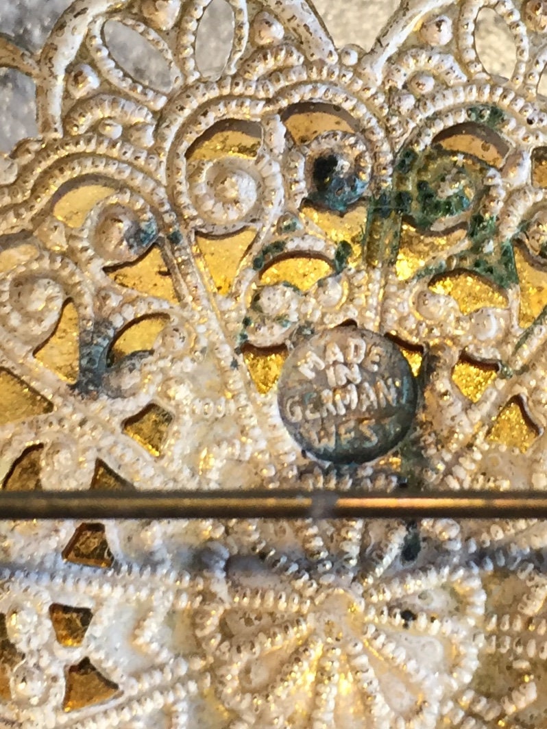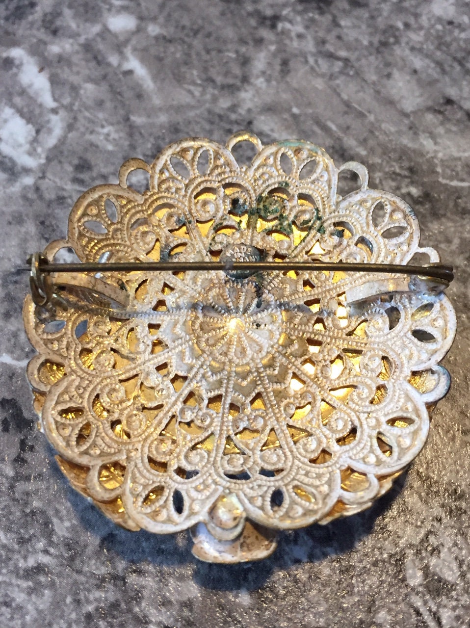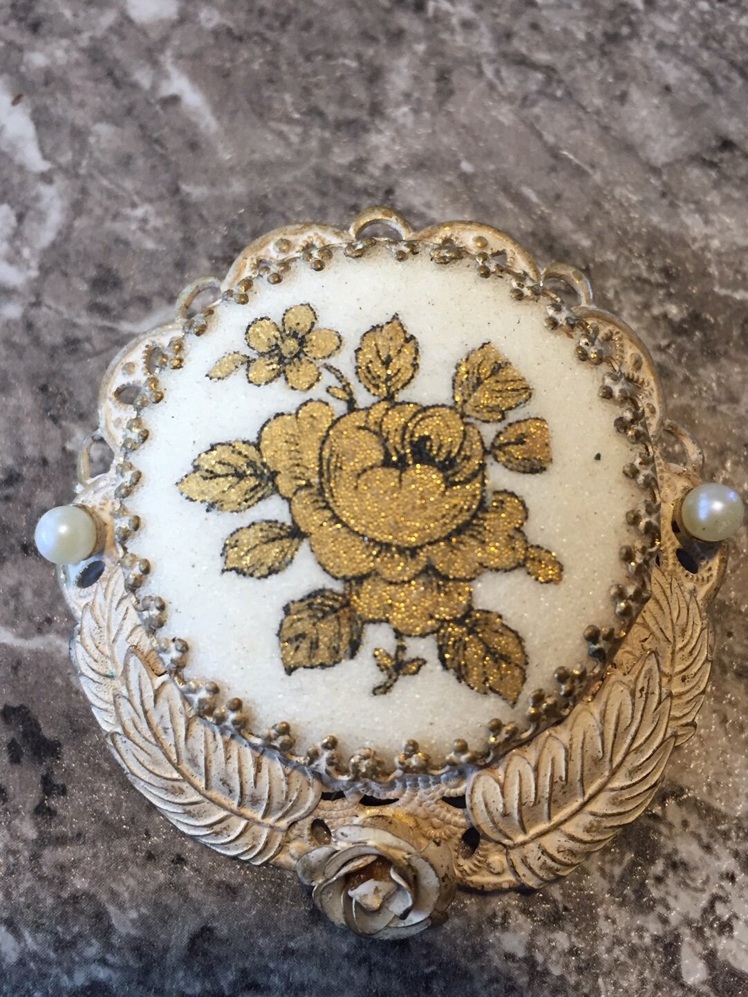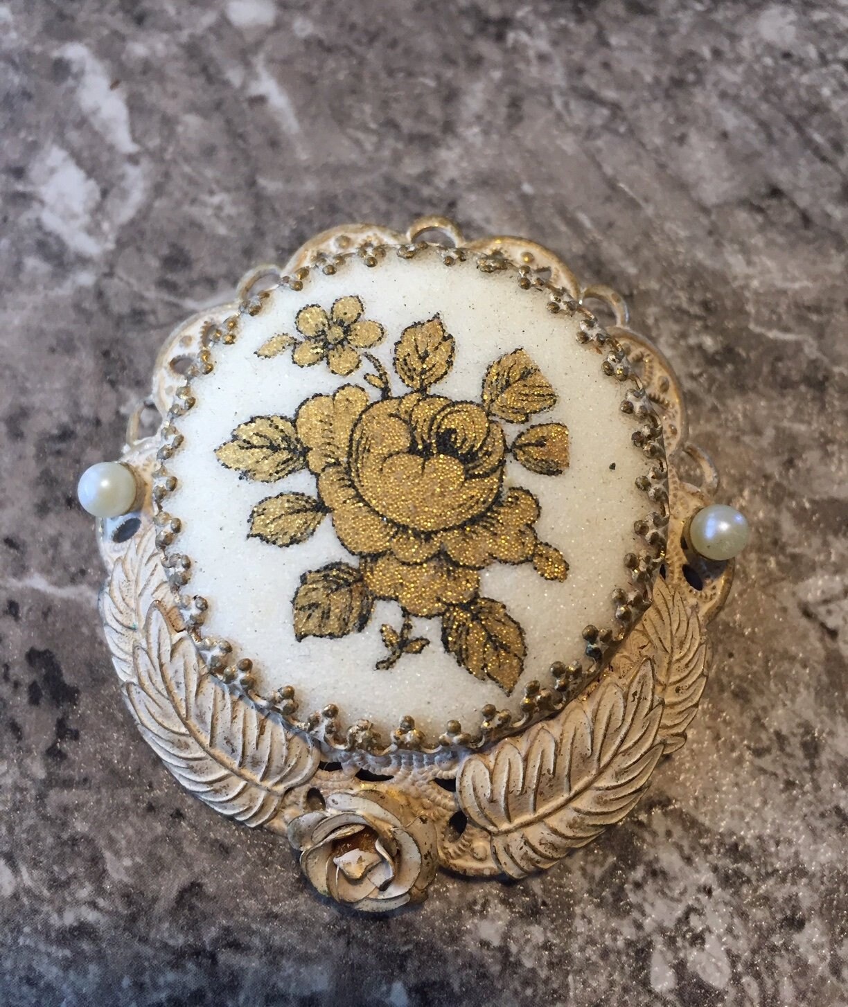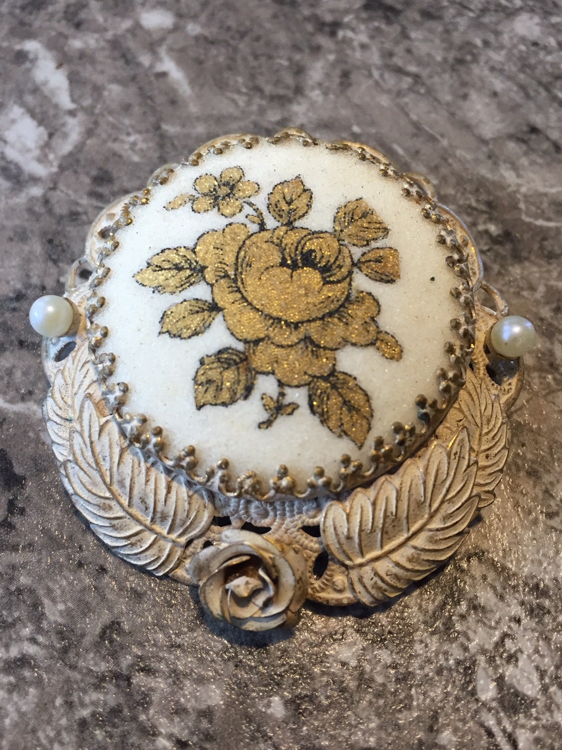 Offered for sale is a fabulous vintage brooch made in West Germany (1950's) Filigree powder pink metal with Gold Rose design on off-white background an 2 pearls (faux? Real? not sure) Size: 2" diameter. Very good condition-pin and latch fine-no missing pieces or finish loss. Marked on back "Made in Germany West"