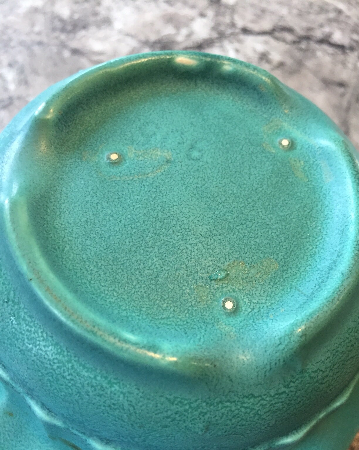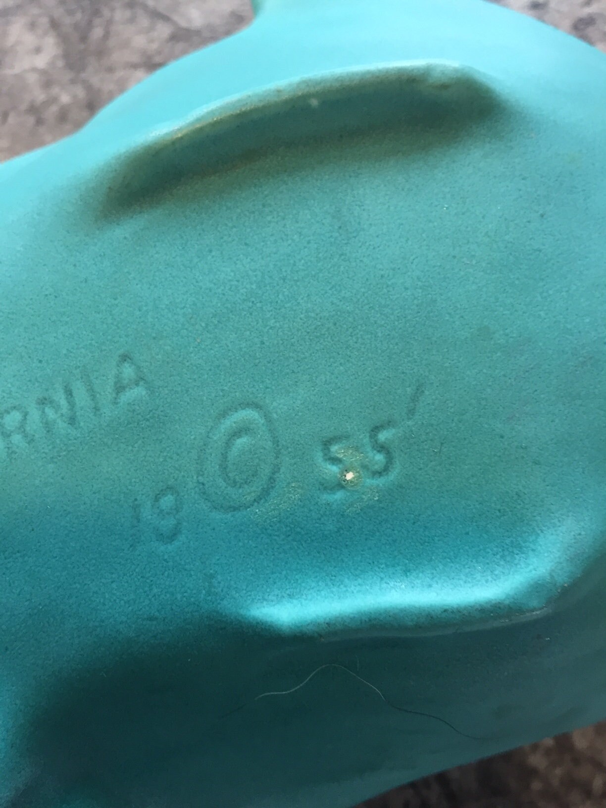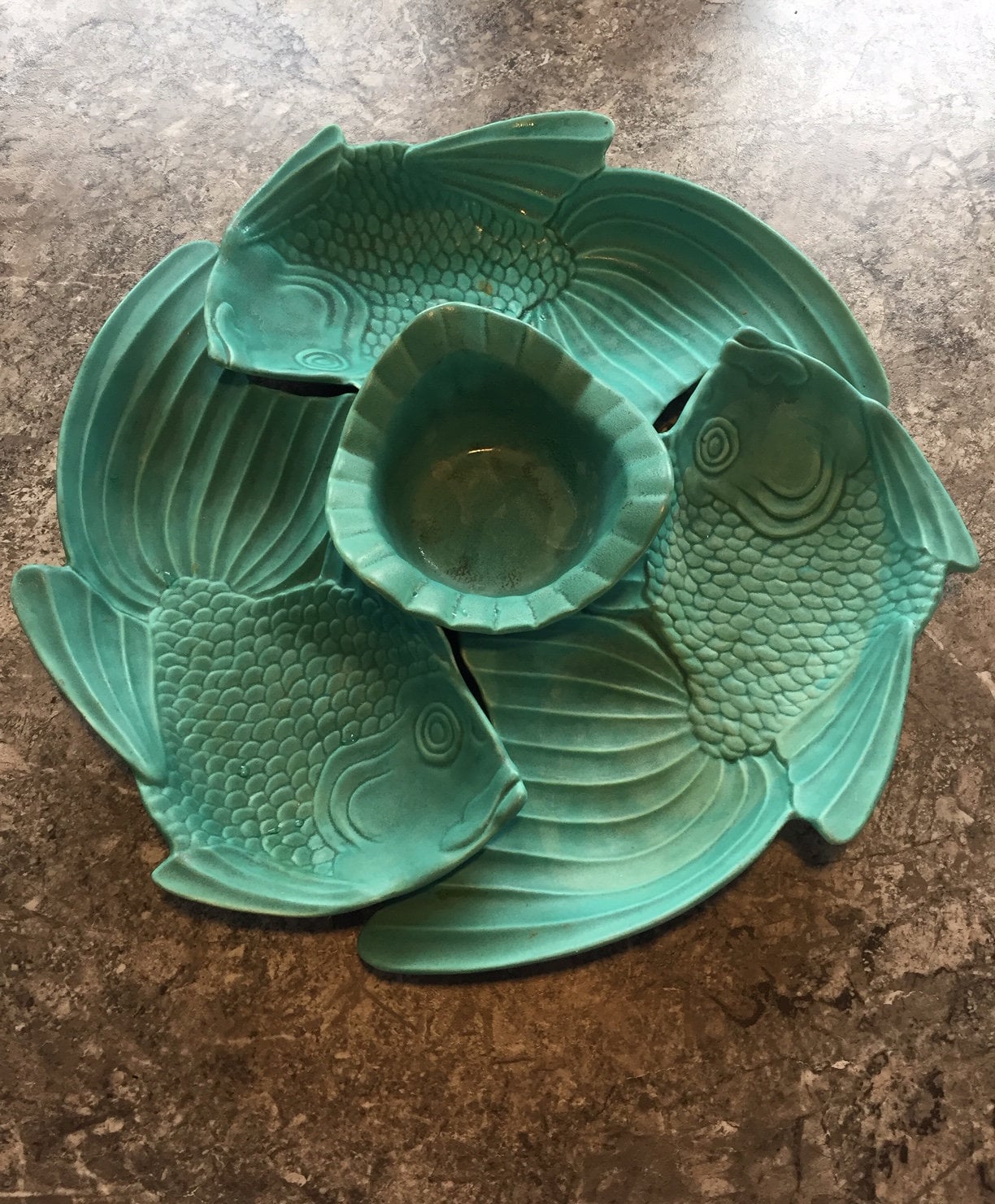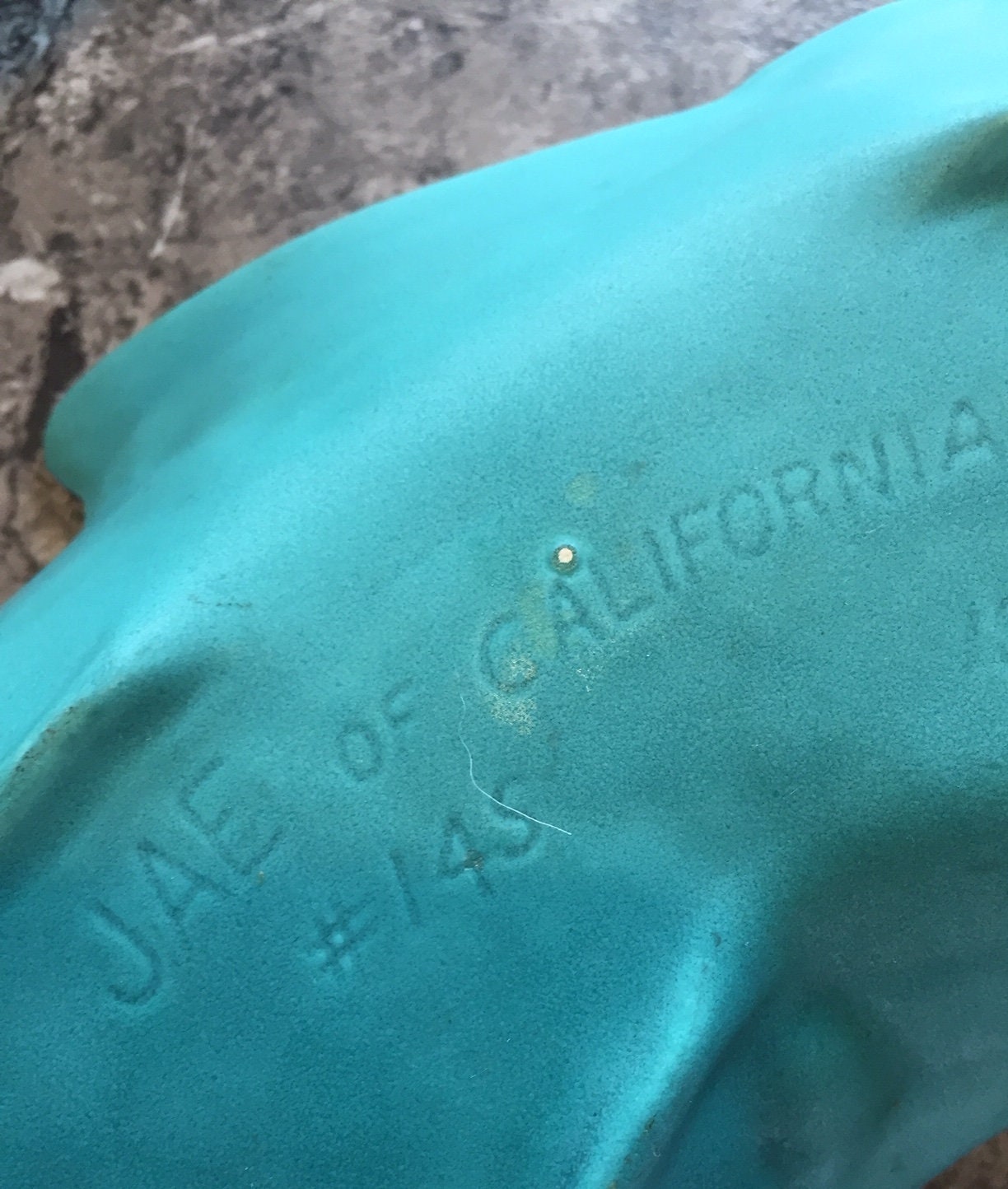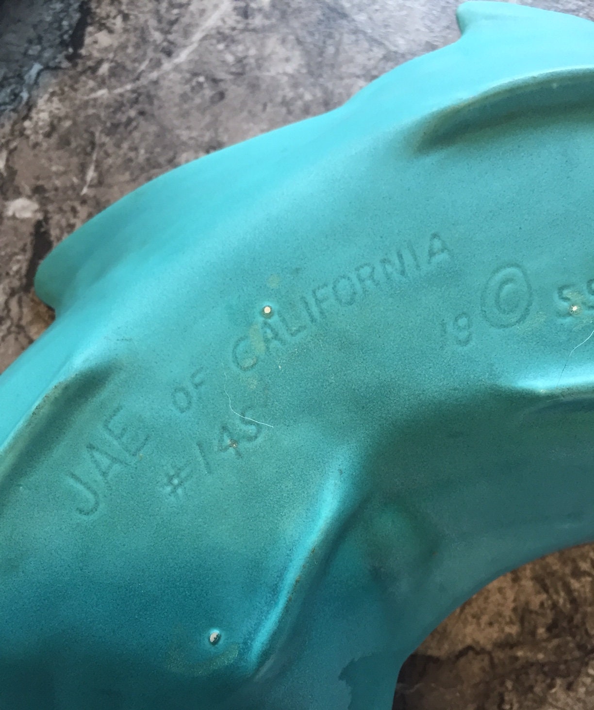 Offered for sale is a beautiful California art pottery set made in 1955. It is signed JAE of California #145 1955 with the copyright symbol. Wonderful mat green finish! The design is three KOI fish around a center bowl. Very good vintage condition: the center bowl has 2 small shallow chips under the rim (see last photo) can be touched up if desired. All the other pieces have no chips, cracks or repairs. Approx. dimensions: 14.5” around when displayed. Fish- 10.5” tip to tail 6” across at widest point, 2 ¼” tall at tallest point. Bowl is 5” across and 2 ¾” high.