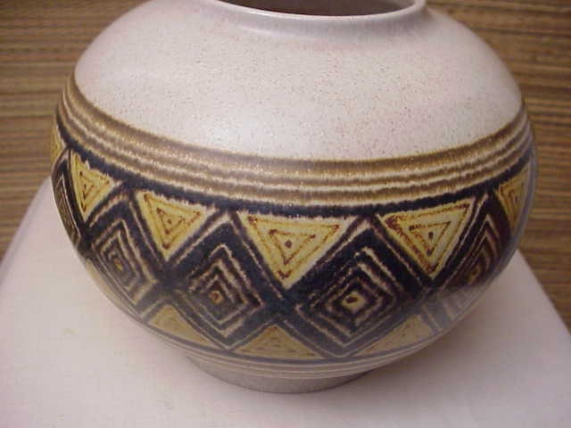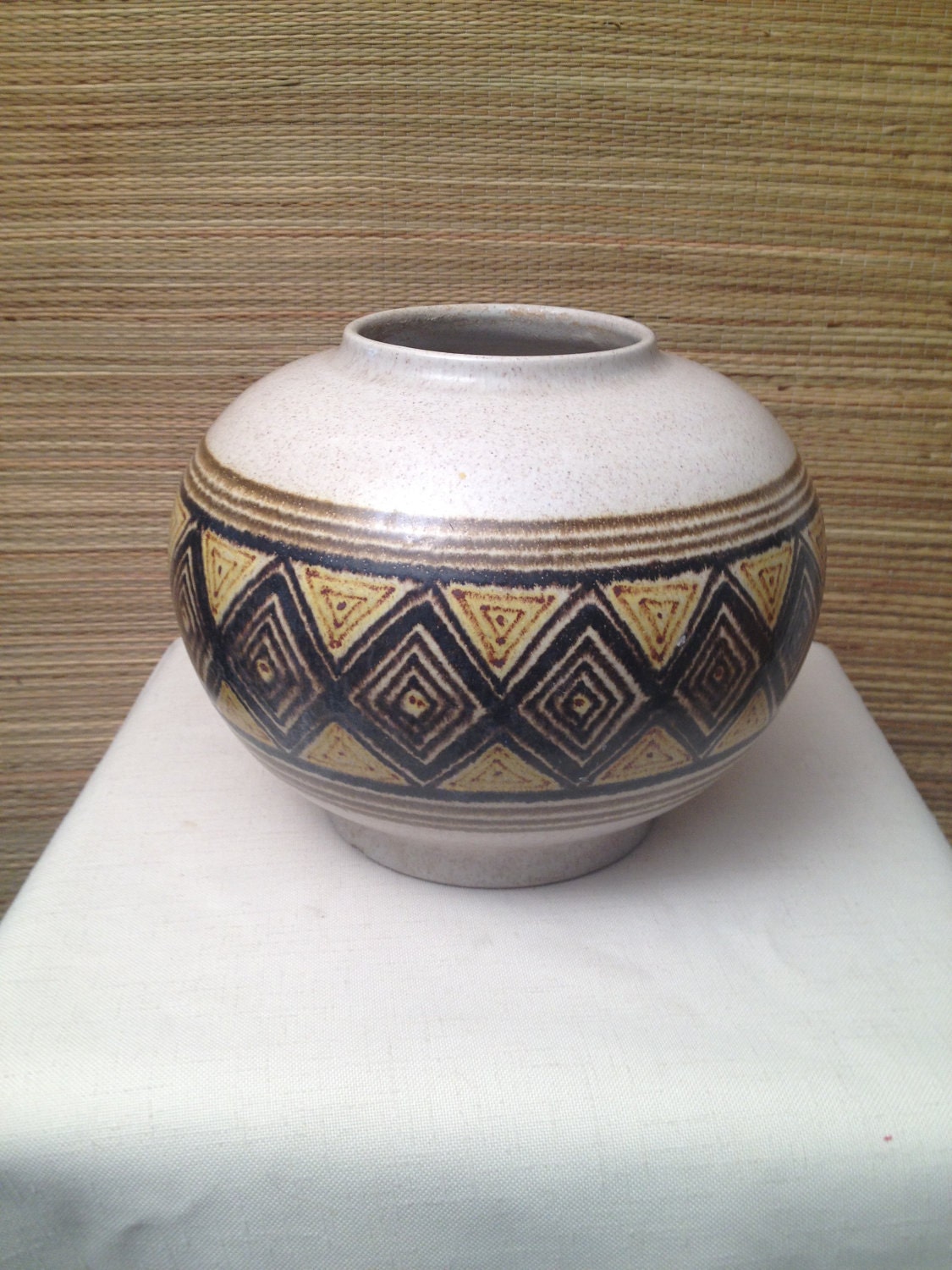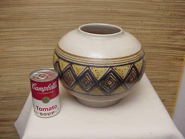Offered for sale is a Fabulous & Large Raymor Italy Art Pottery Vase. Beautiful Design and very well done! Marked Raymor Italy and numbered (R 756) on bottom - Original Raymor label on bottom also. Size: Condition-! Approx Size: 9" diameter X 7.5" tall. Condition: NOTE: two tiny glaze flakes on base and two larger chips on one side of very bottom - both are on the same side (see last photo) The two larger base chips cannot be seen when the vase is turned one way for display. No other cracks, hairlines, repairs-Just a very nice vase.